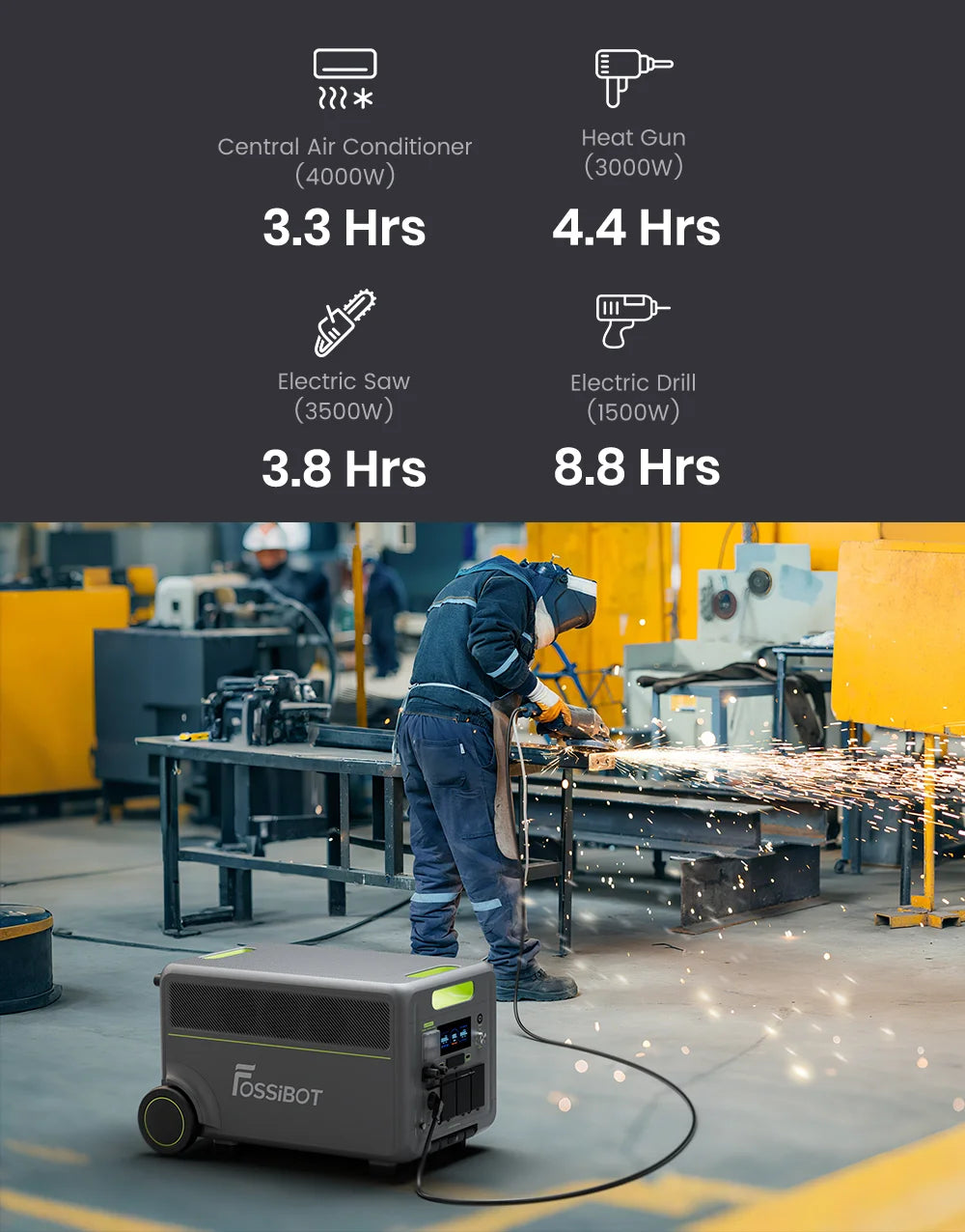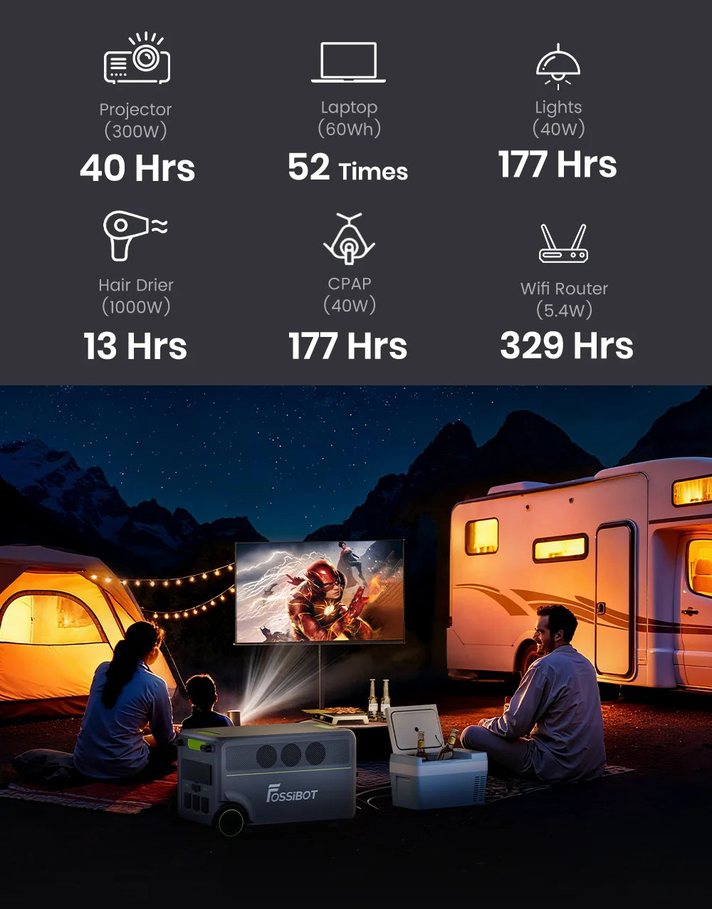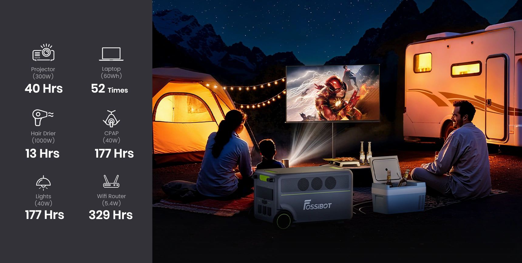 Qu'importe l'ouragan, l'orage ou la panne. Le FOSSiBOT F7200, avec sa batterie longue autonomie, sa sortie CA surpuissante et son voltage global, devient votre pilier énergétique. Une puissance inébranlable.