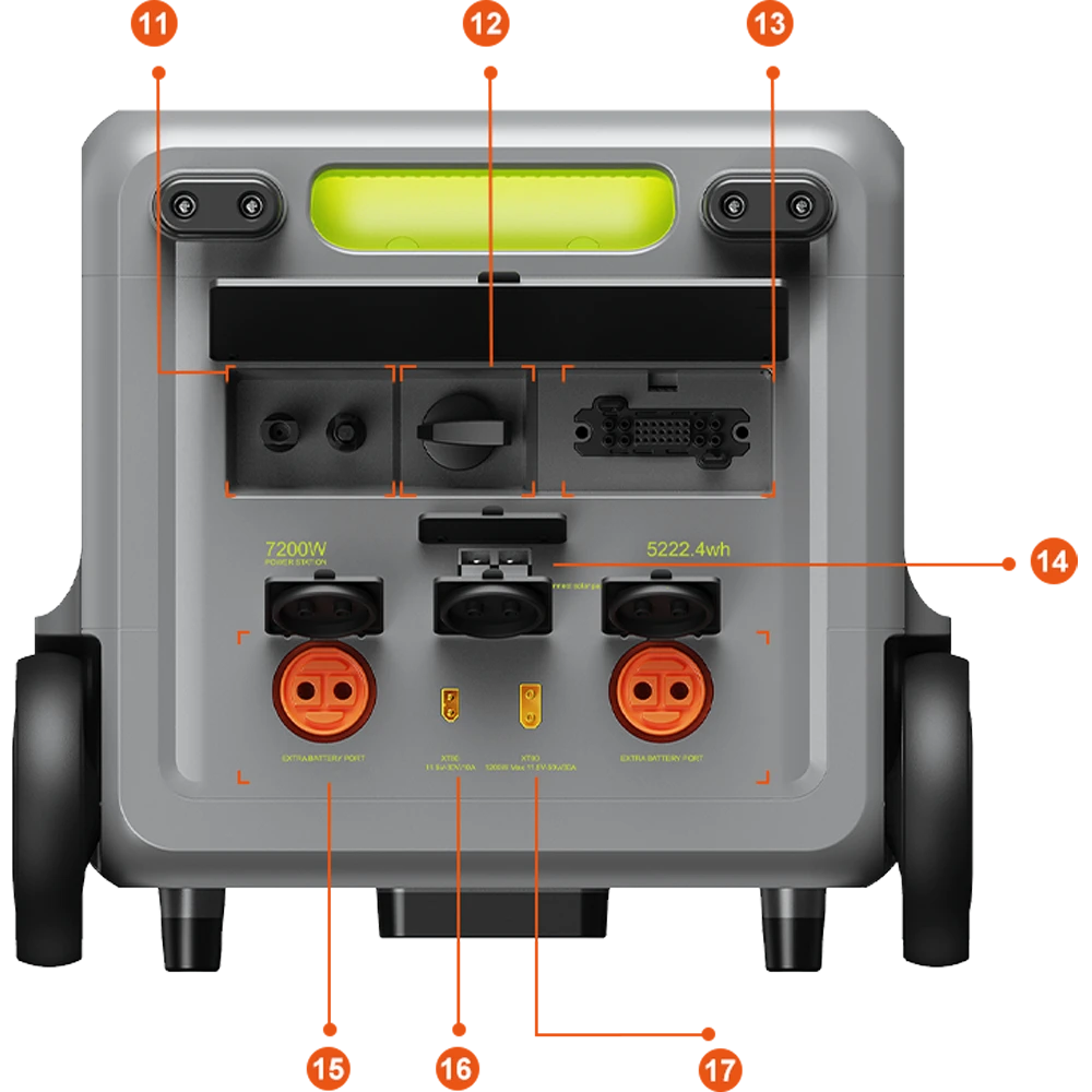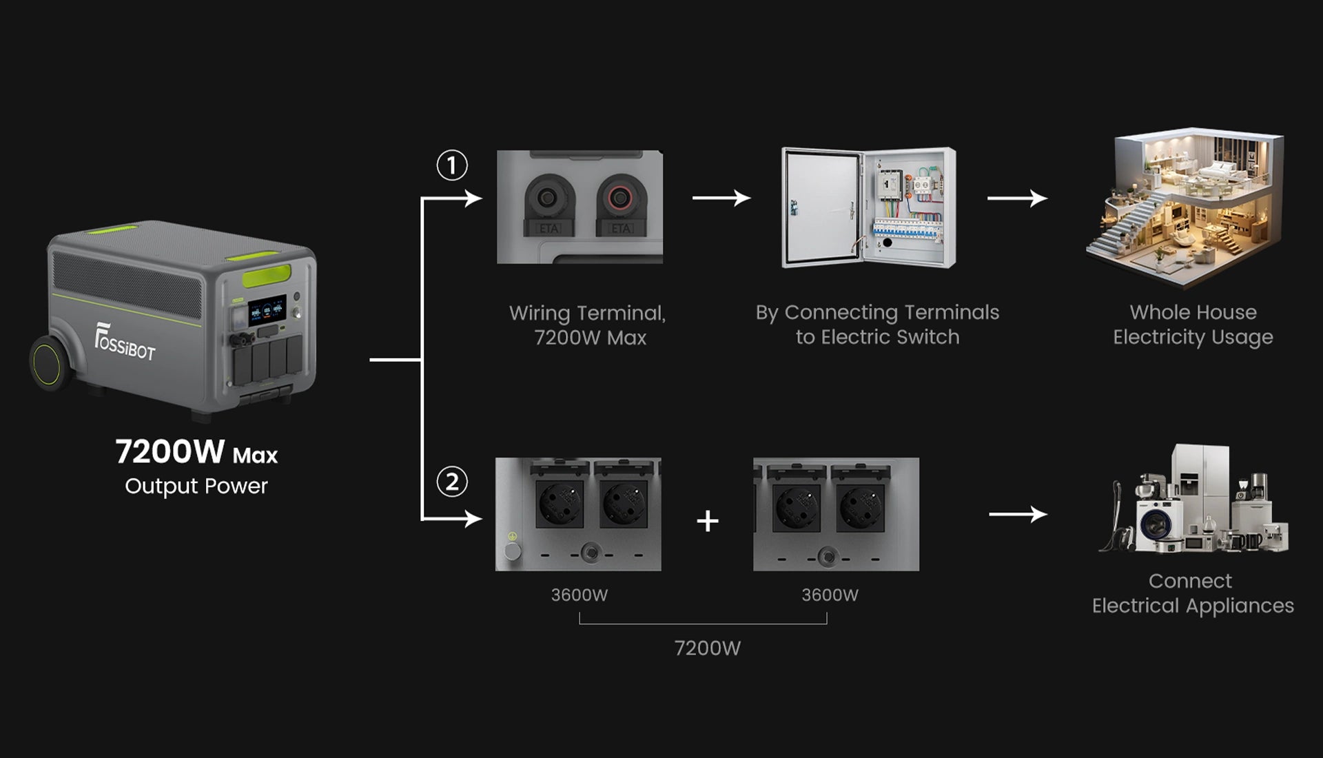 Puissance max de 7200 W accessible via 2 modes : utilisation des 2 blocs de prises CA 3600 W, ou câblage des bornes au tableau électrique maison pour alimentation globale.