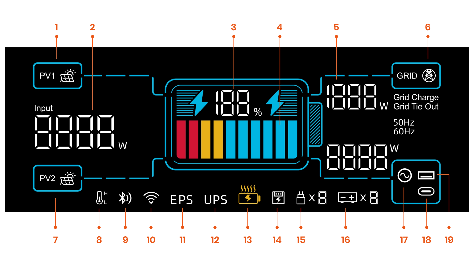 • Sortie AC 1200 W : fournit jusqu’à 1200 W en mode hors réseau, avec un transfert automatique de 1 ms lors des coupures, garantissant le fonctionnement continu des appareils essentiels.